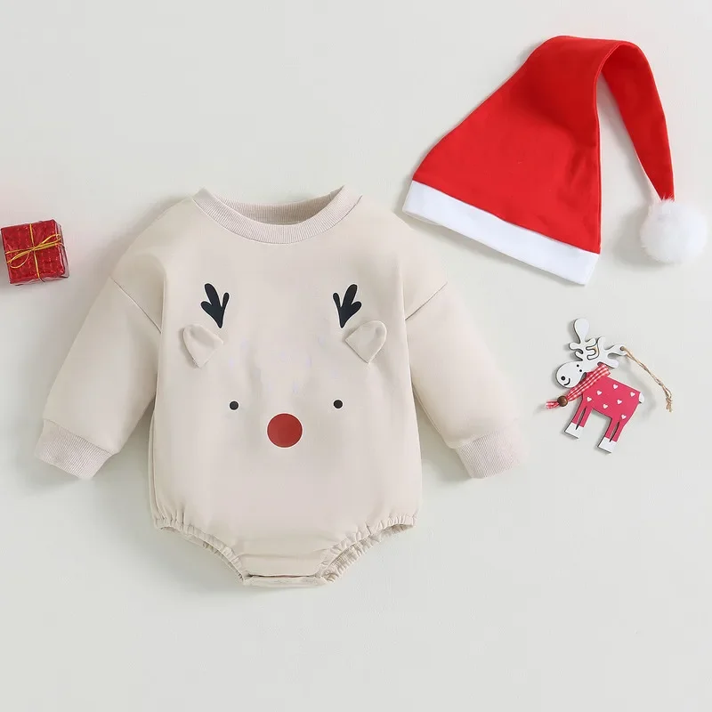 Christmas Newborn Baby Girl Boy Bodysuit Autumn Clothes Outfit Long Sleeve Elk Print Jumpsuit with Hat 2-piece Outfit Baby Items