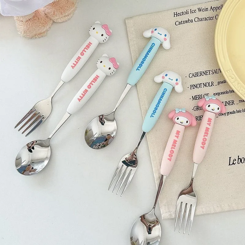 2Pcs Sanrio Stainless Steel Spoon Forks Hello Kitty Kuromi Melody Portable Utensils Feeding Tableware Set Girls Kids Gift