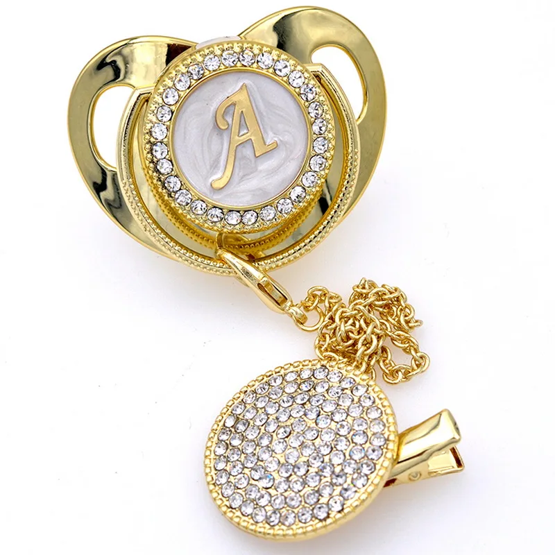 26 Name Initial Letter Baby Pacifier and Pacifier Clips BPA Free Silicone Infant Nipple Gold Bling Newborn Dummy Soother chupete