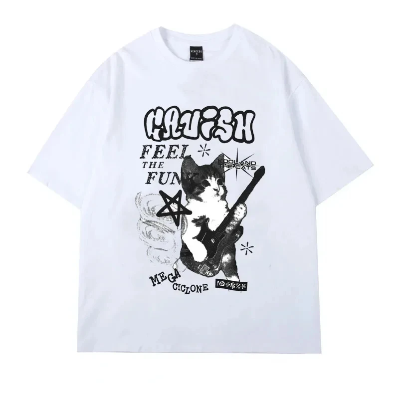 Men's and Women's American Cat Guitar Print Pattern Short Sleeved T-shirt Loose Korean Retro Summer Y2K Street Style Clothing