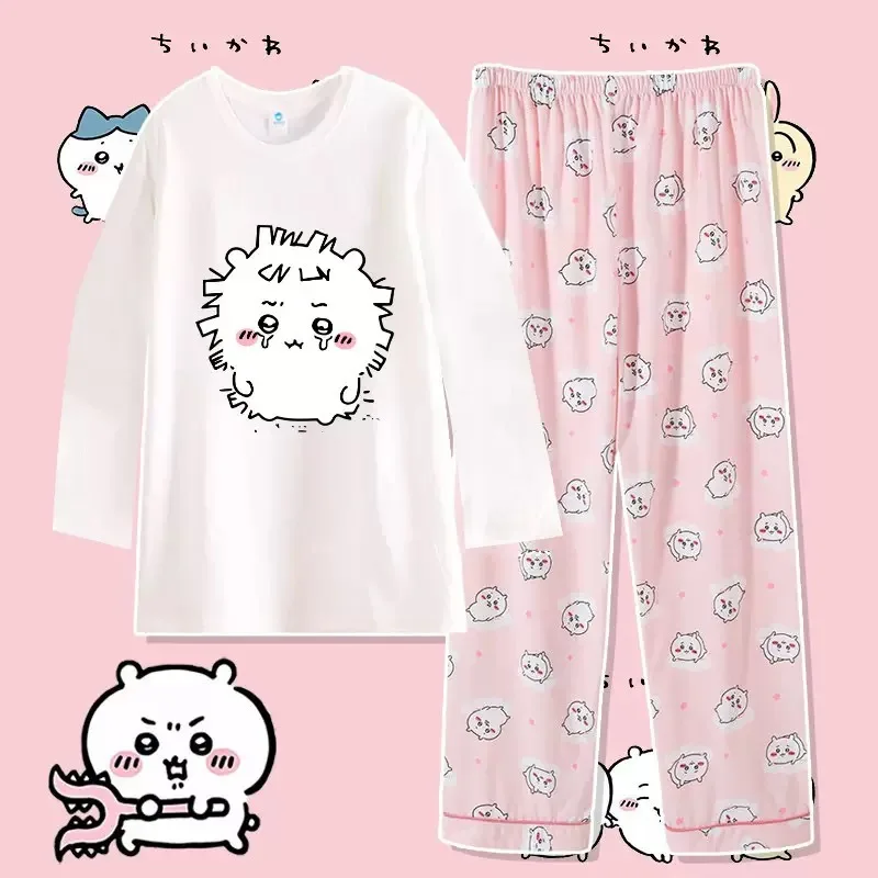 Anime Usag Hachiware Summer thin pajamas round neck Loose long-sleeved shirt and pants Cute cartoon pattern household clothes