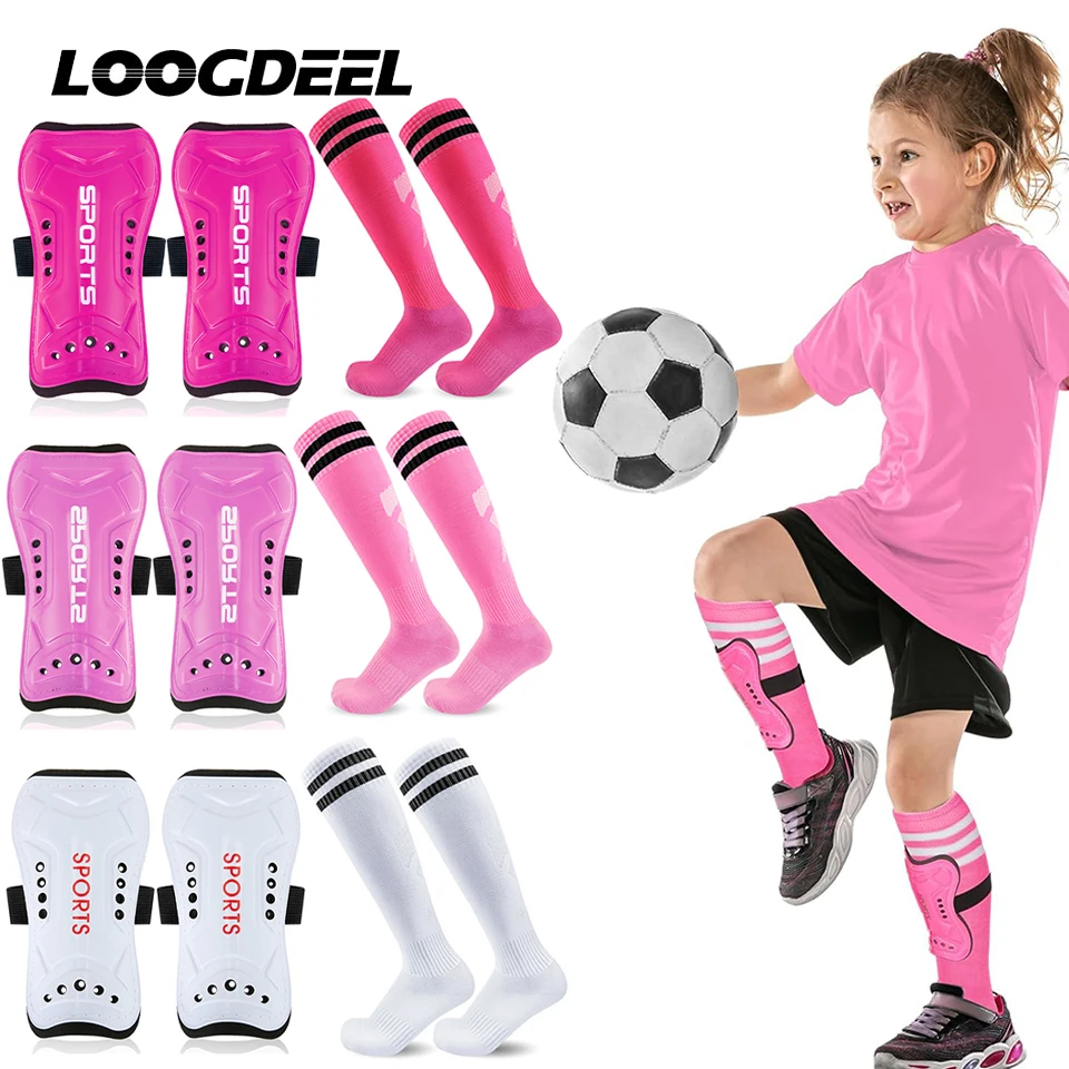Loogdeel 2Pair Boys Girls Football Shin Protection Board Sports Sock Set Kids Soccer Over Knee Socks Legging Support Guard Child