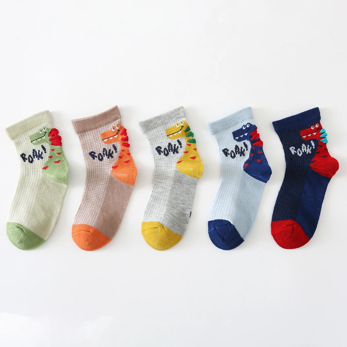 5pairs cartoon dinosaur patterned cute socks for boys and children, breathable, comfortable, high elasticity, sweat wicking,
