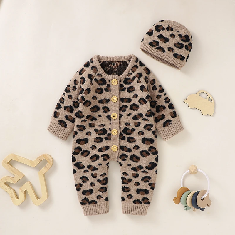 Winter Baby Rompers Clothes Fashion Leopard Knitted Newborn Boys Girls Jumpsuits Hats Outfits 2pcs Set 0-18m Infant Toddler Wear