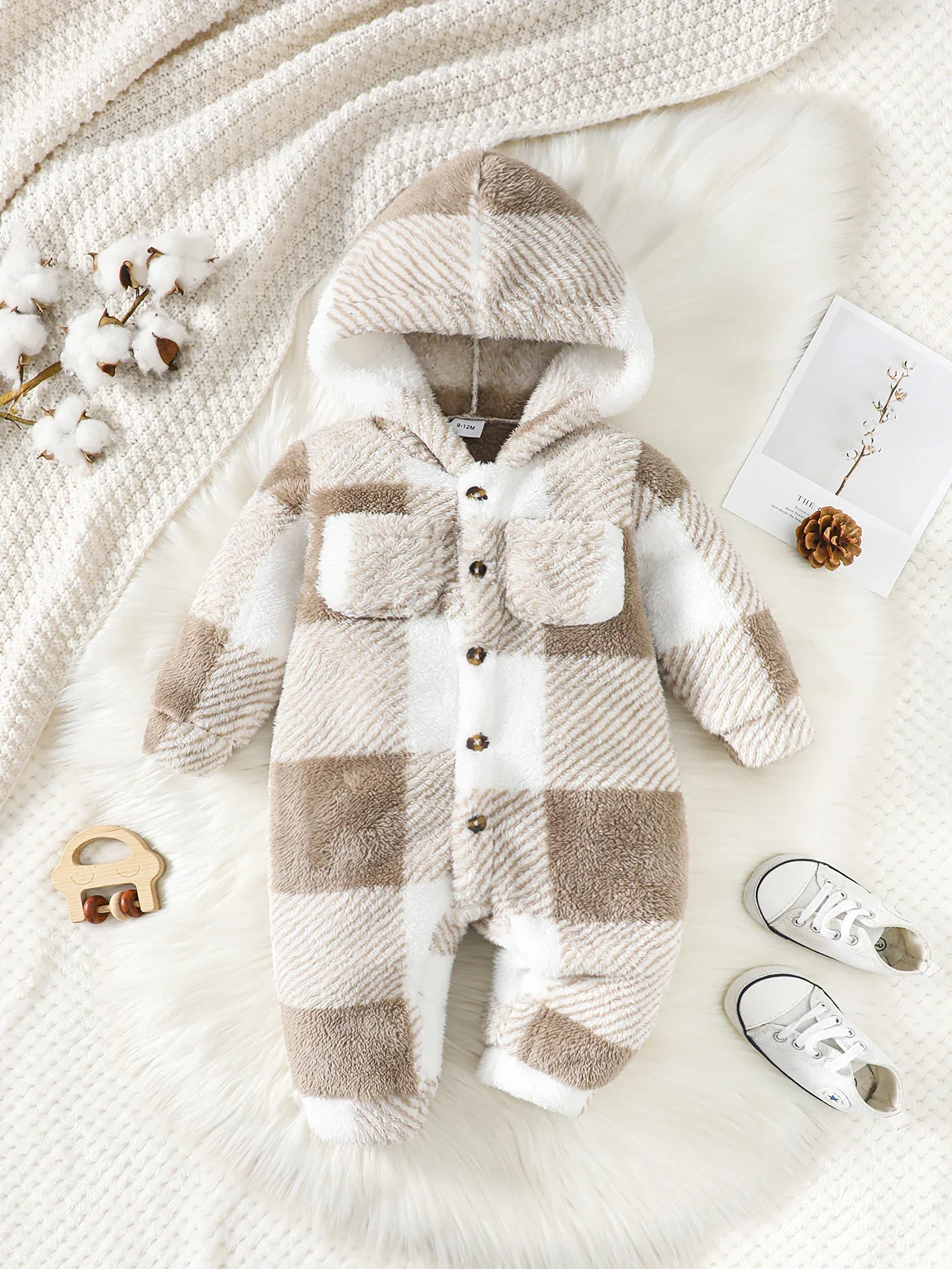 3-24 Months Baby Boys&Girls Romper Plaid Hooded Long Sleeved Plush Jumpsuit Winter Warm Bodysuit Clothes for Toddler Boy&Girl