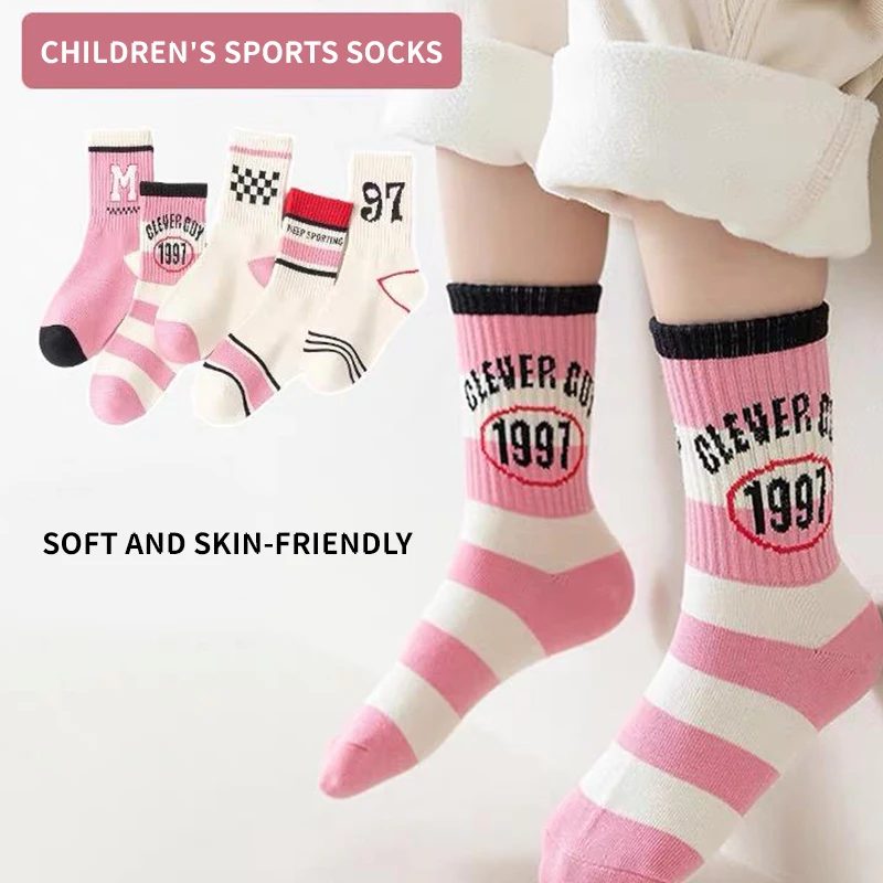 5 Pairs Letter Pattern Kids Girls Mid-calf Socks Striped High Quility Cotton Combed Cozy Soft Breathable Sports Sock for Child