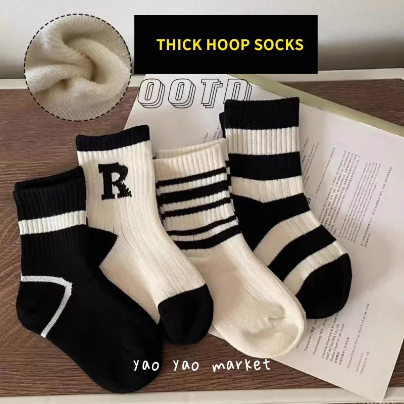 4Pairs Letter Striped Thick Warm Cotton Kids Half Socks Cute Cozy Sports Soft Breathable Brushed Children's Sock For Boys Girls