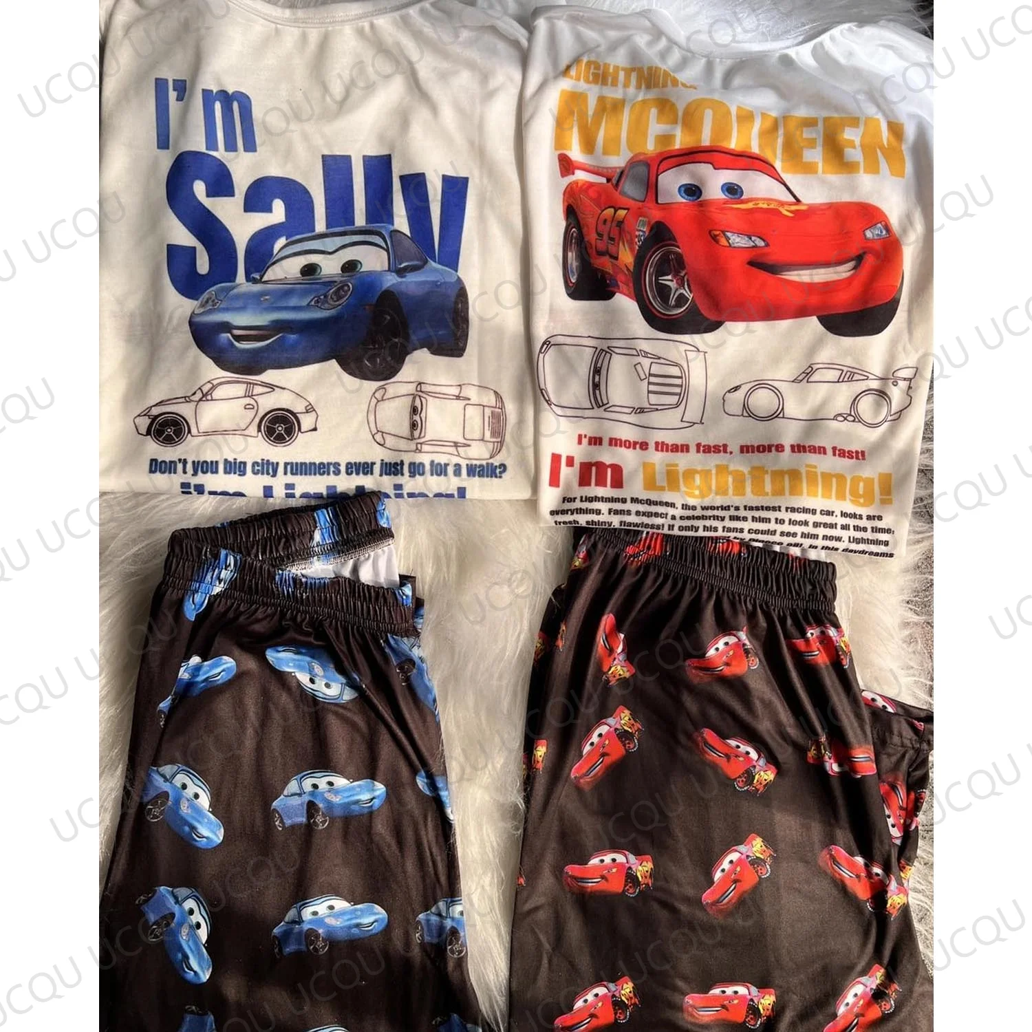 2025 The Cars Lightning McQueen&SALLY Summer Cotton T-Shirt With Pajama pants Oversized Suit For Adult/Kids his-and-hers clothes
