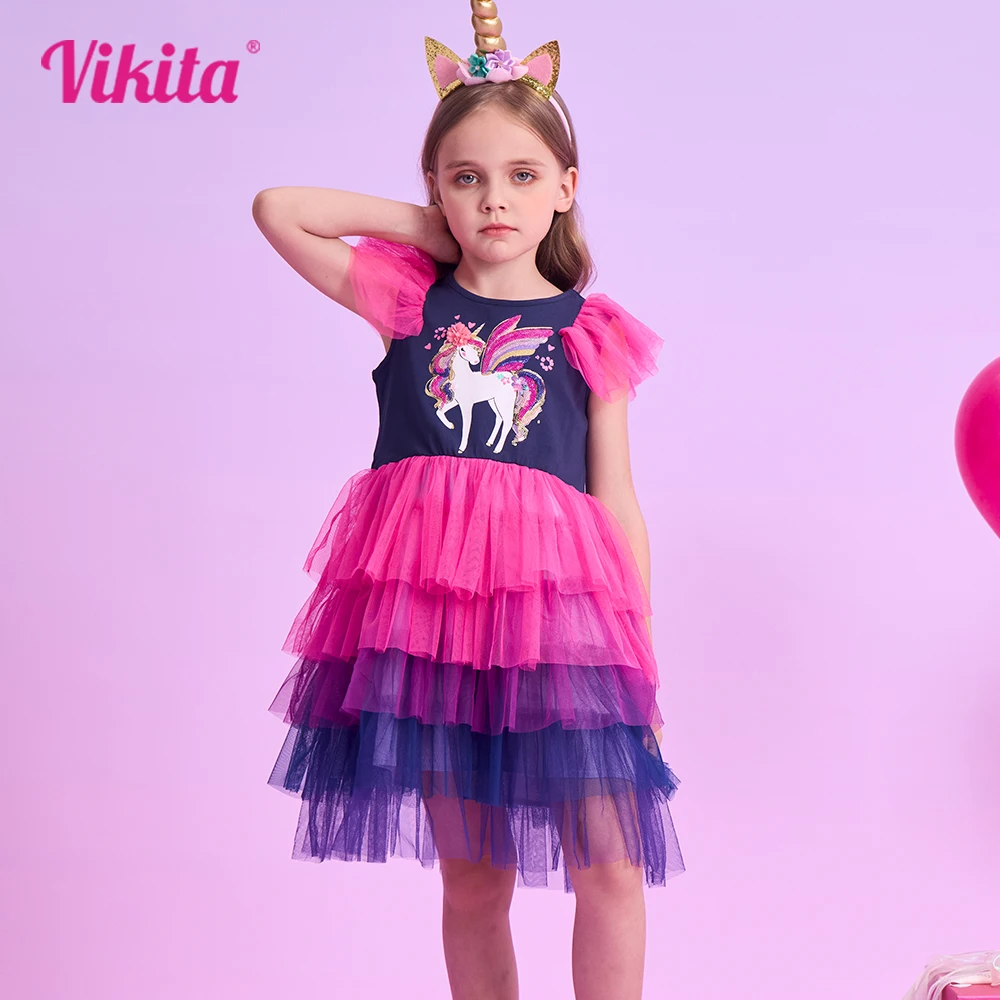 VIKITA Girls Summer Dress Kids Princess Gradient Sequined Wedding Birthday Party Gown Elegant Fashion Frocks Unicorn Costumes
