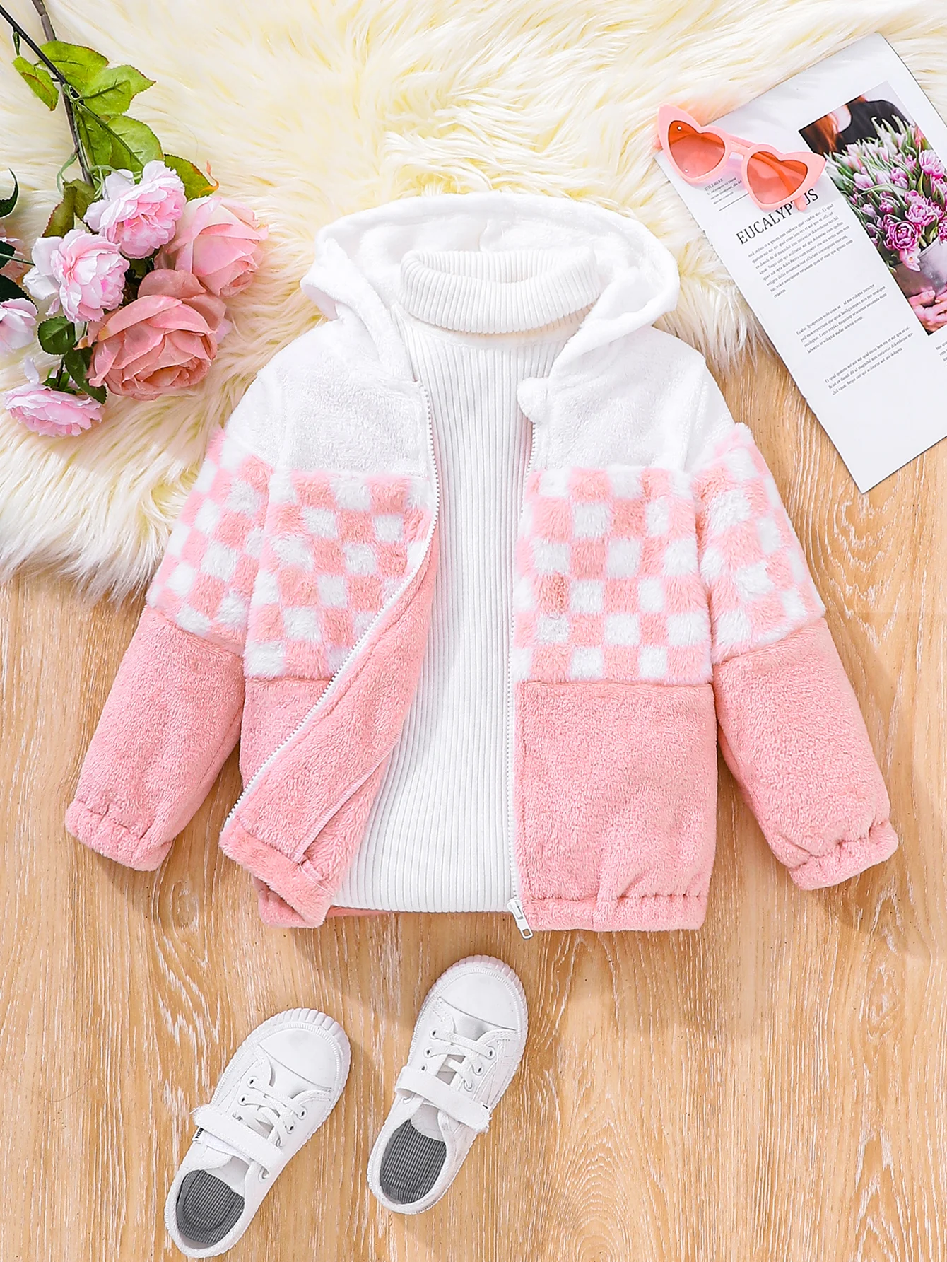 Girls Autumn Winter Seasonal Color Block Zipper Hooded Plush Jacket for Kids