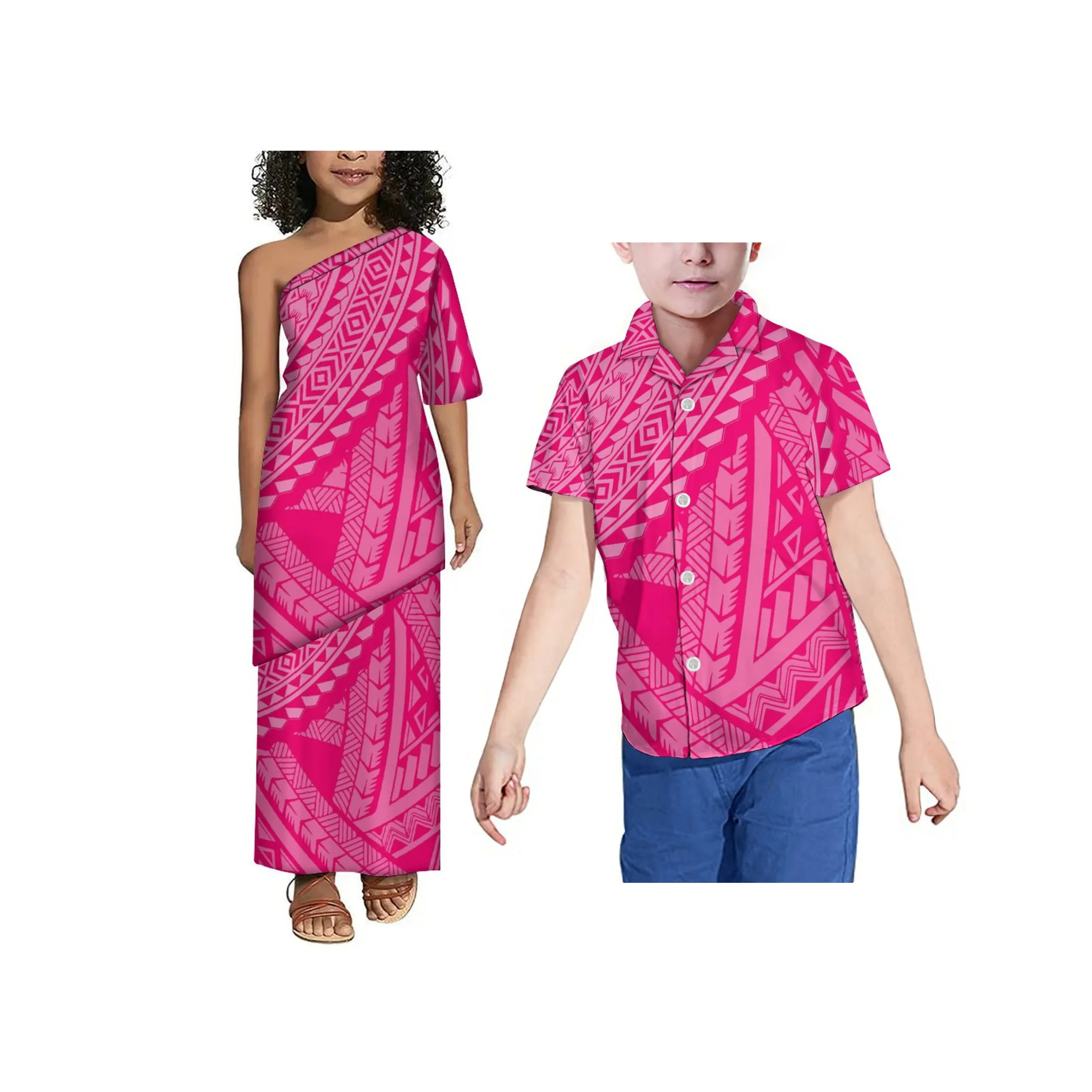 Drop Shipping Tonga Polynesian Tribal Print Summer Kids Off Shoulder Short Sleeve Dress Samoan Puletasi Clothes 2 Pieces Sets