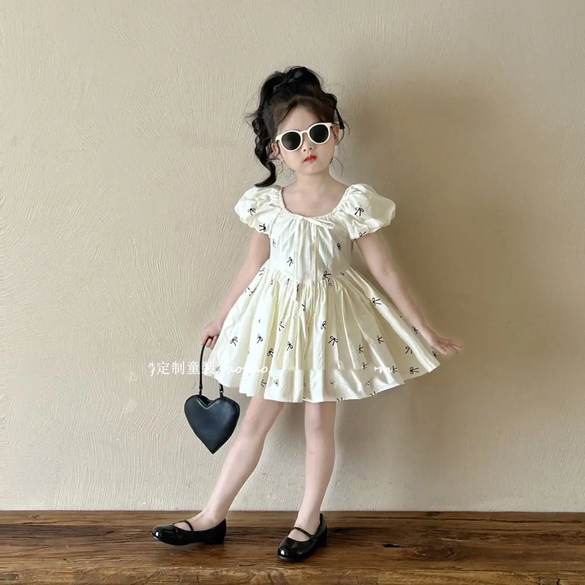 Girls French Bubble Sleeve Dress 2025 Summer New Korean Little Girls Bow Printed Sweet Princess Dress