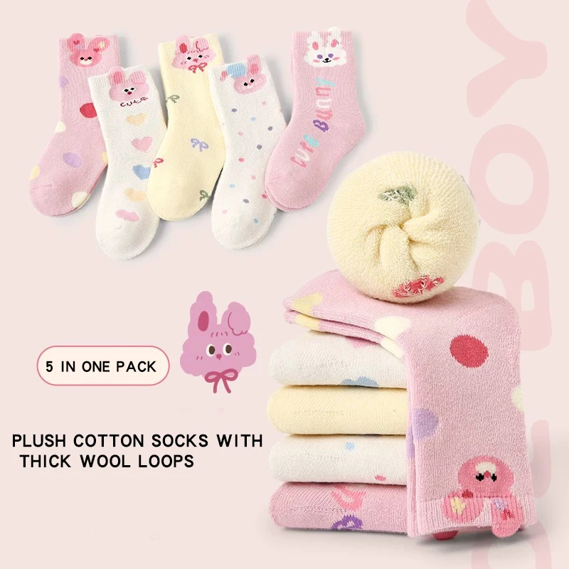 5 Pairs Thicken Warmth Cartoon Rabbits Kids Girls Mid-calf Socks Soft Elastic Comfortable Indoor And Outdoor Children Socks