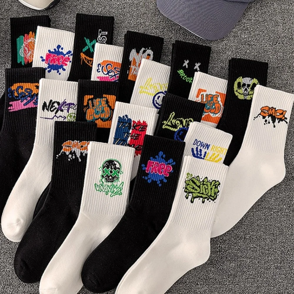 Hip Hop Skateboard Original Design Black White Skull Socks Personality Street Hip Hop Sports Middle Tube Cotton Women's Socks