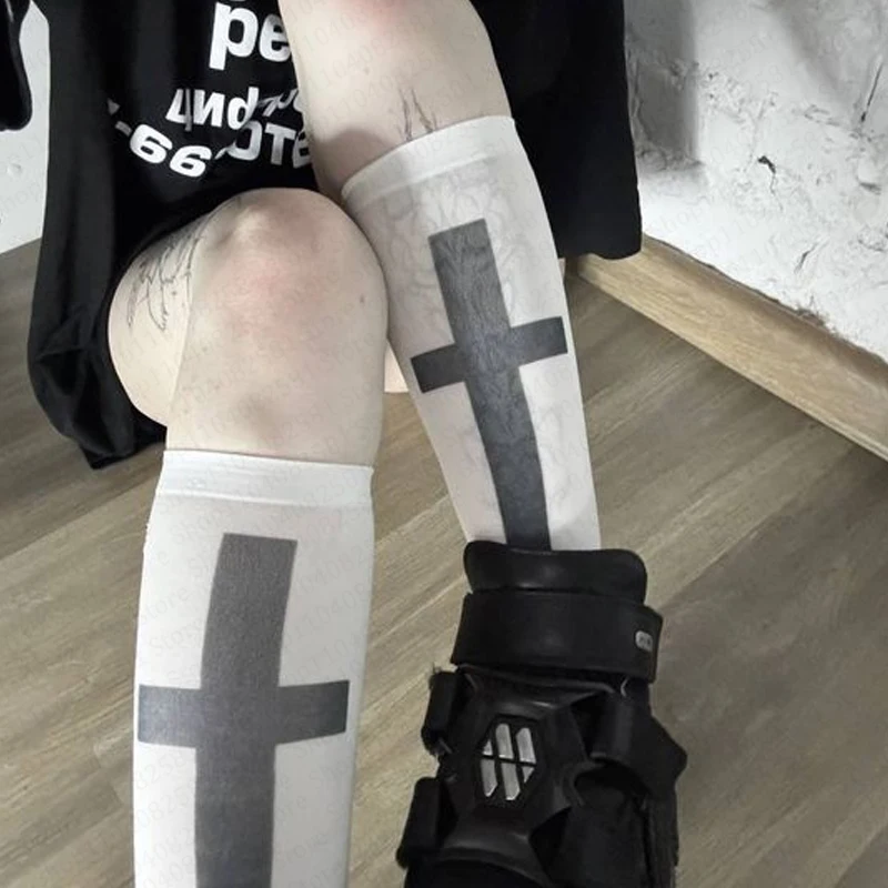 Gothic white fashion graffiti cross print long socks Harajuku knee high socks Y2K style cosplay cute socks Kawaii Emo girl