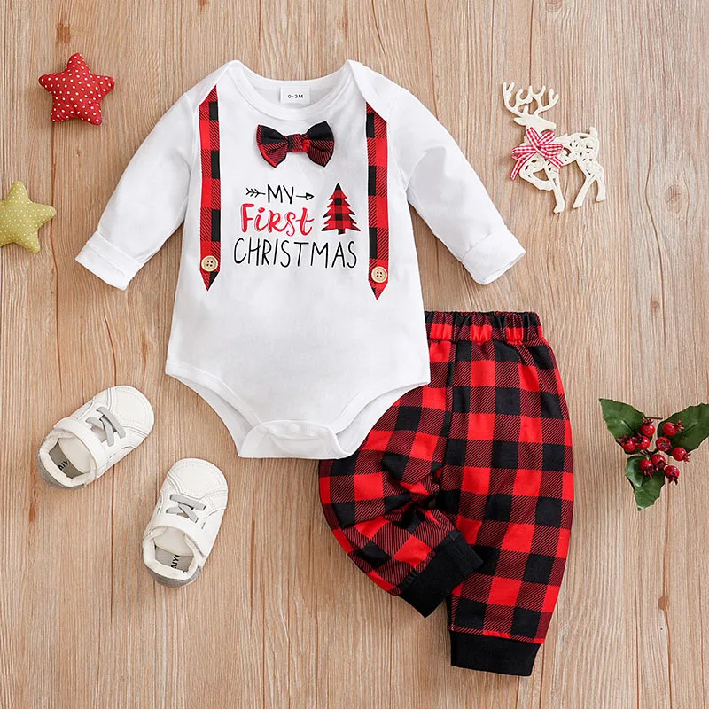 Spring And Autumn Boys And Girls Set Christmas Style Handsome Korean Baby Long Sleeve Bodysuit+Two Piece Pants