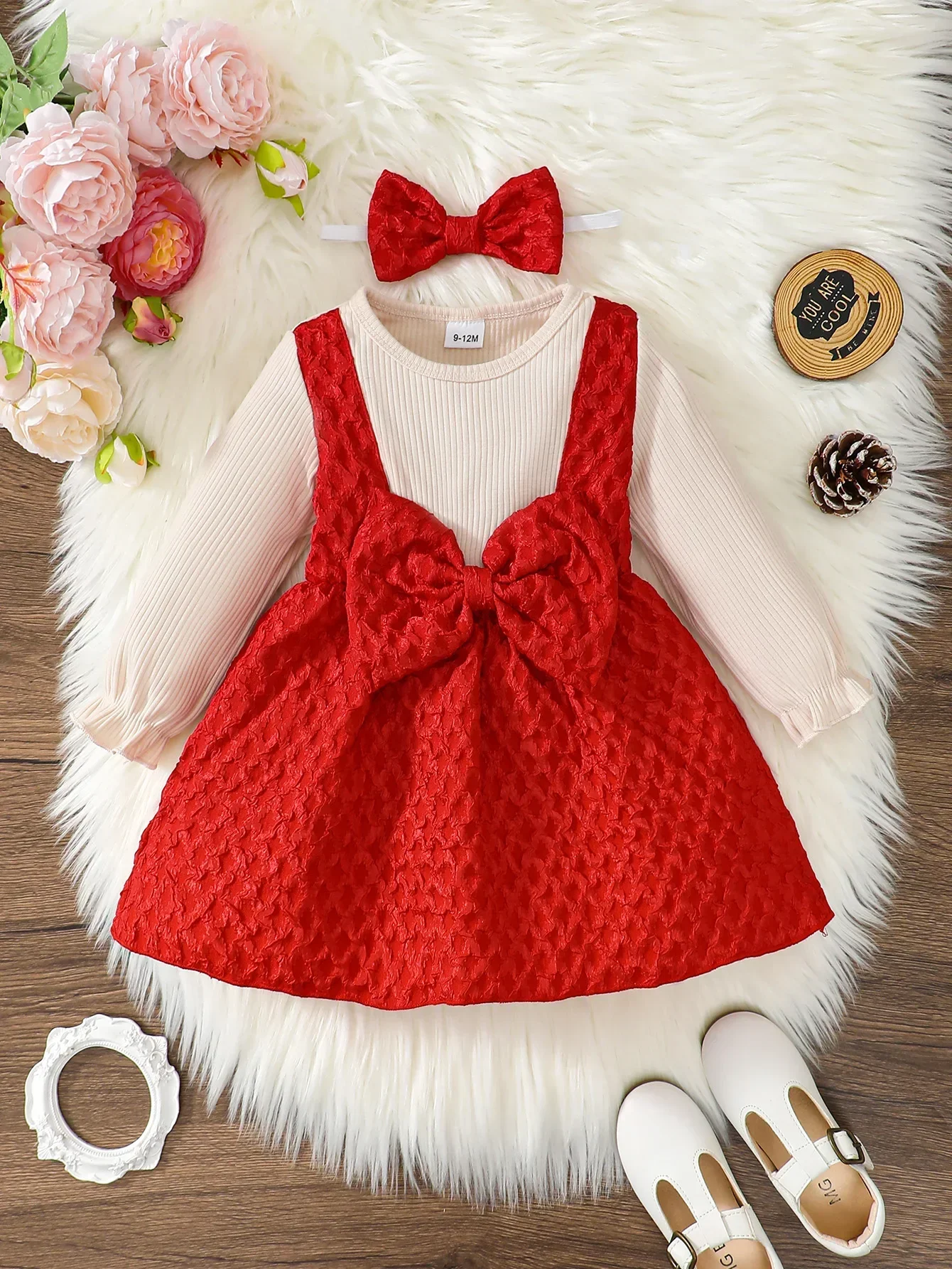 Newborn Baby Girl Dress Long Sleeves Patchwork with Bow One Year Old Dress New Year&Christmas Dress Up Wear for Toddler 0-3Years