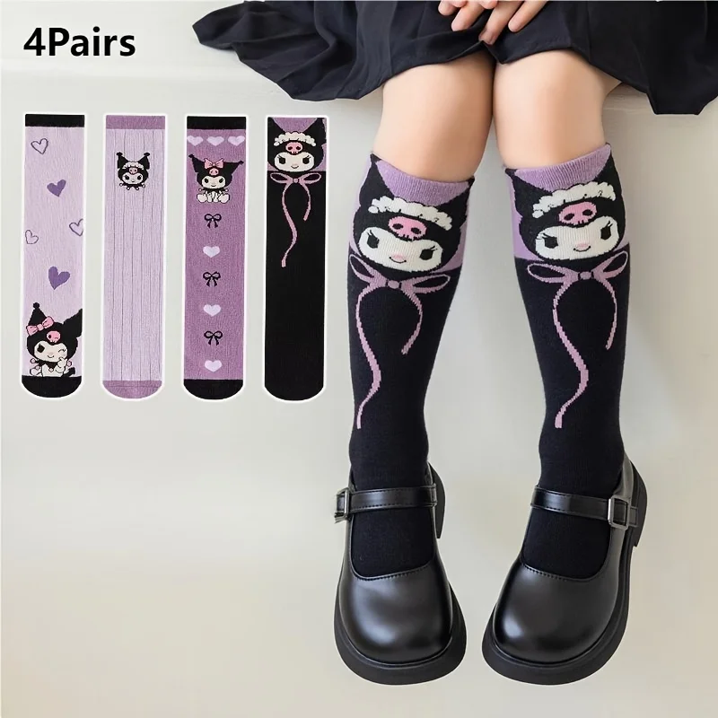 4 Pairs Kawaii Anime Sanrio Kuromi Pattern Girl's Over The Calf Stocking Crew Socks, Breathable Comfy Casual Kids Cartoon Socks