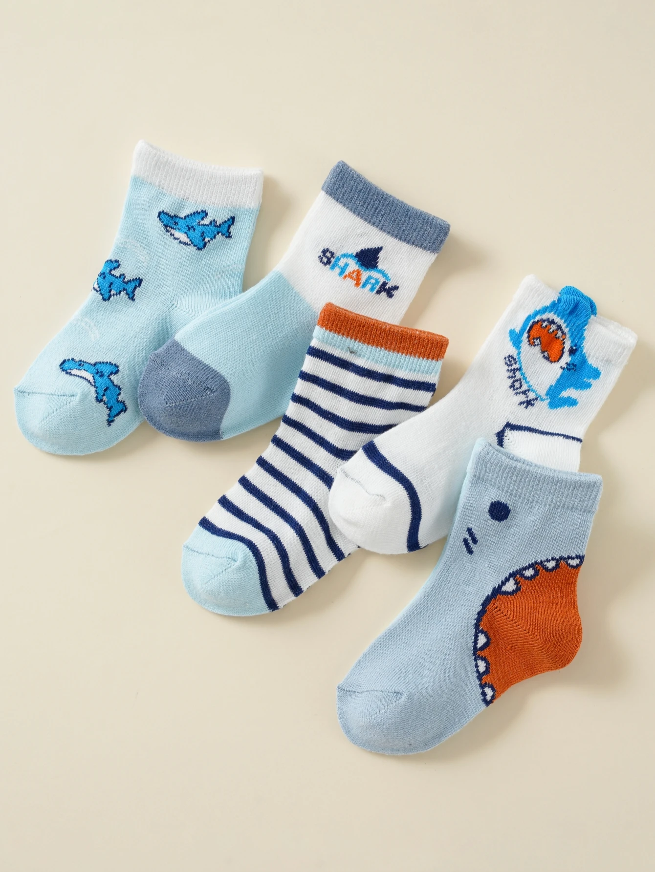 5 pairs of spring and summer thin boys' socks, comfortable, breathable, cute cartoon shark children's mid tube socks