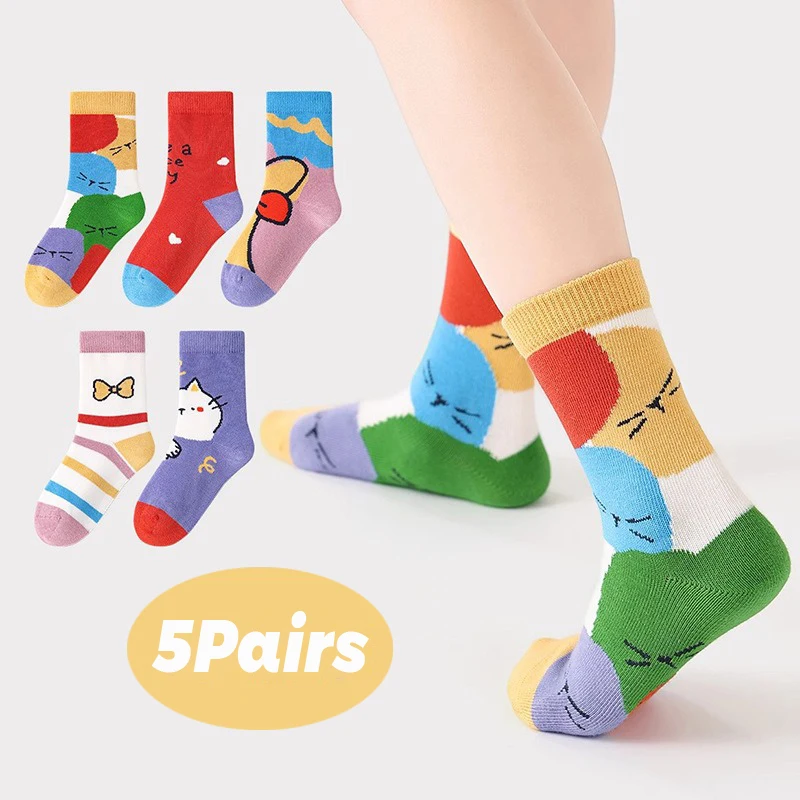 5 Pairs Children's Socks Girl Cute Cartoon Pattern Student Autumn and Winter Mid Tube Socks