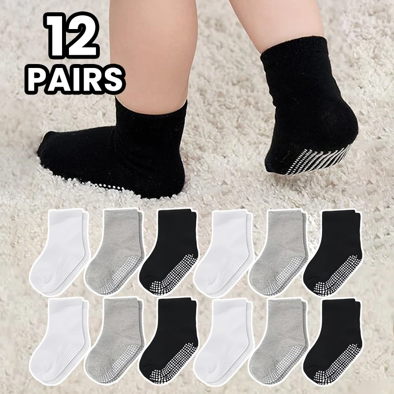 12 Pairs Grip Crew Socks with Non Slip/Anti Skid Soles for Baby Infants Toddlers Kids Boys Girls