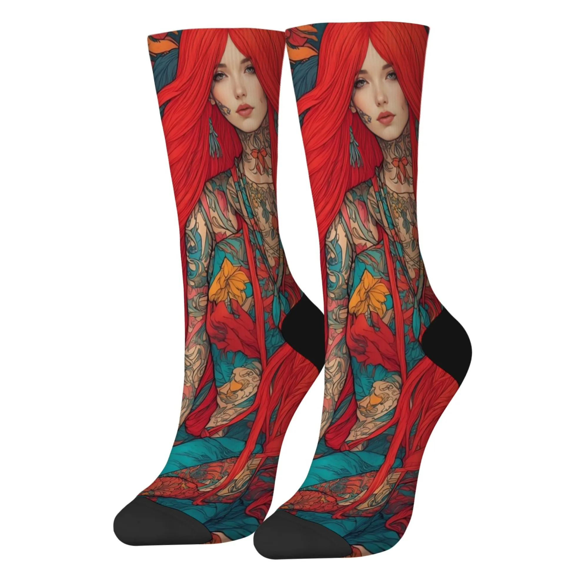 Stylish Tattooed Girl Graphic Crew Socks, Edgy Style for Streetwear, Daily Matching & Art Enthusiasts, Comfortable Portable