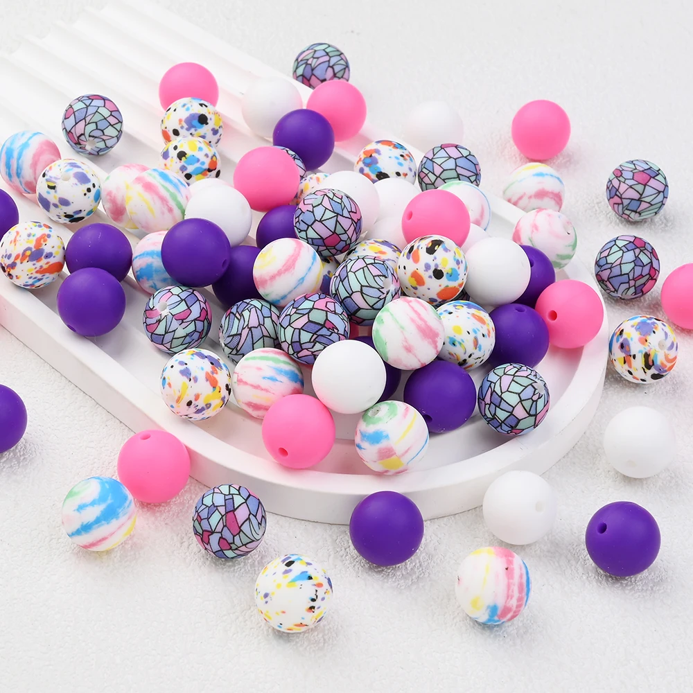 50Pcs Colored Patterned Silicone Beads Set Non-toxic Silicone Beads Focus Beads for Bracelet Baby Pacifier Chains Accessories