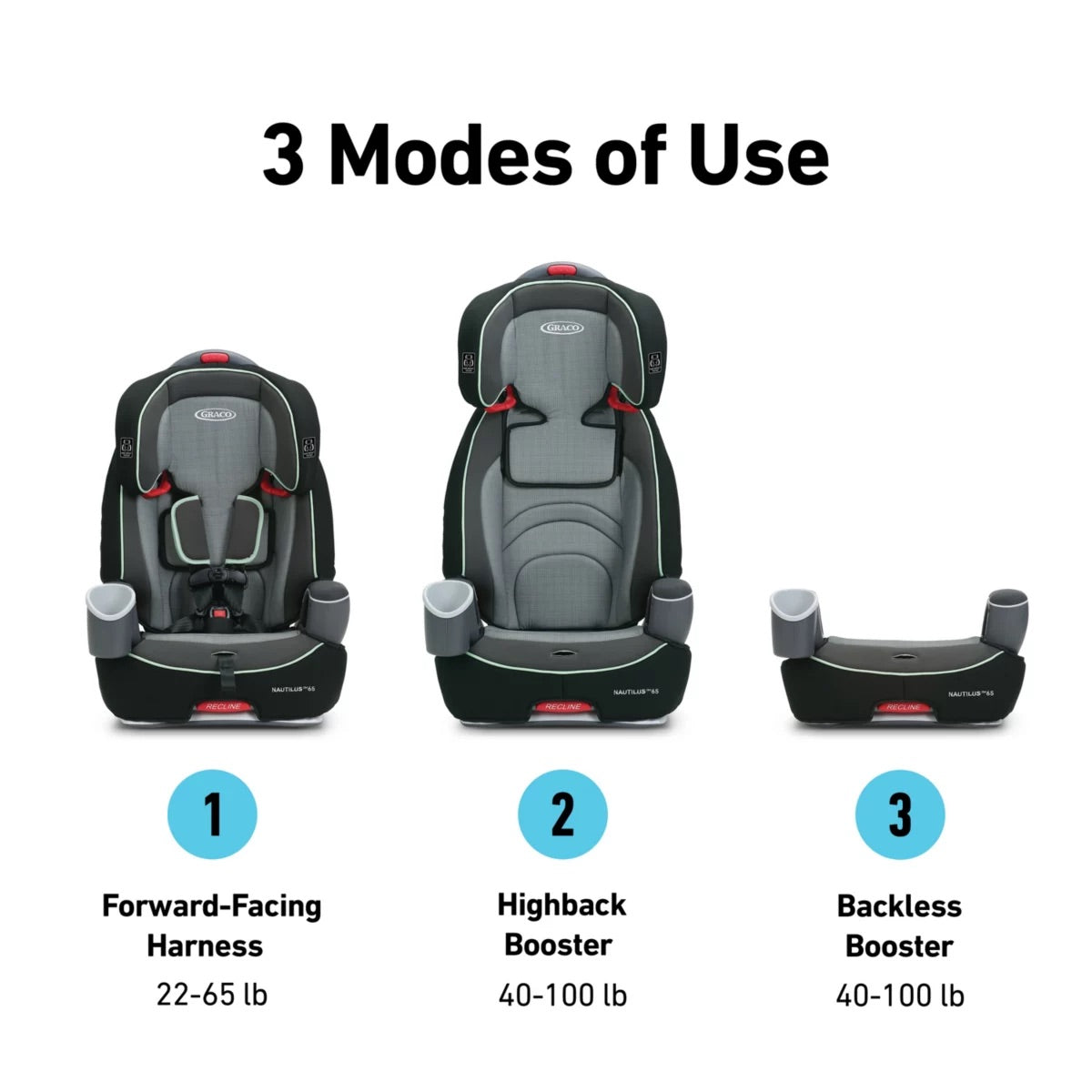 The Graco Nautilus 65 3-in-1 harness booster car seat can be used from toddler to youth, keeping your growing child safe. It secures your child in a 5-point harness from 20-65 lb, converts to a highback booster from 40-100 lb, and becomes a backless...