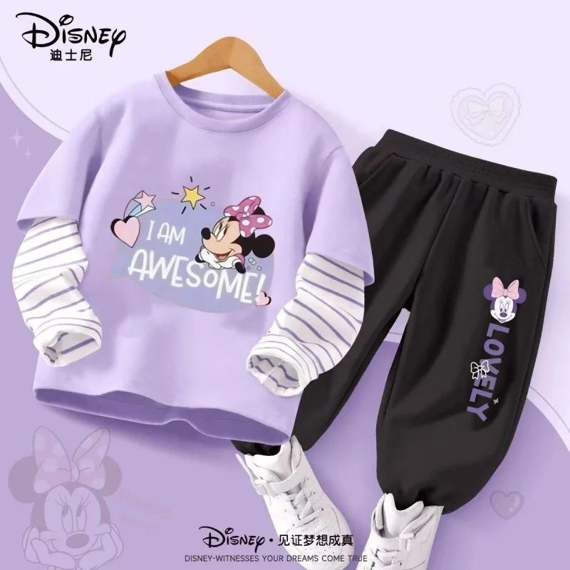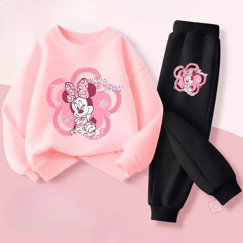 DISNEY Spring Autumn Children's Pullover Sets Minnie Print Girls Clothing Sets Breathable Thin Kids Sweatshirt Pant 2pcs Suit