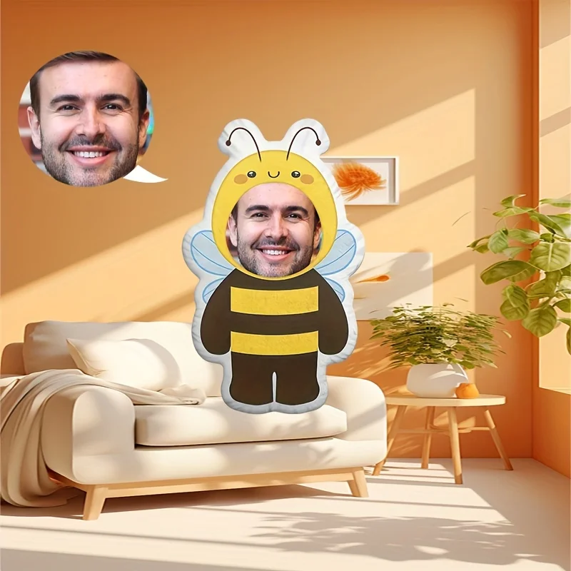 A customizable bee shaped photo printed pillow with double-sided design, machine washable, filled with polypropylene cotton