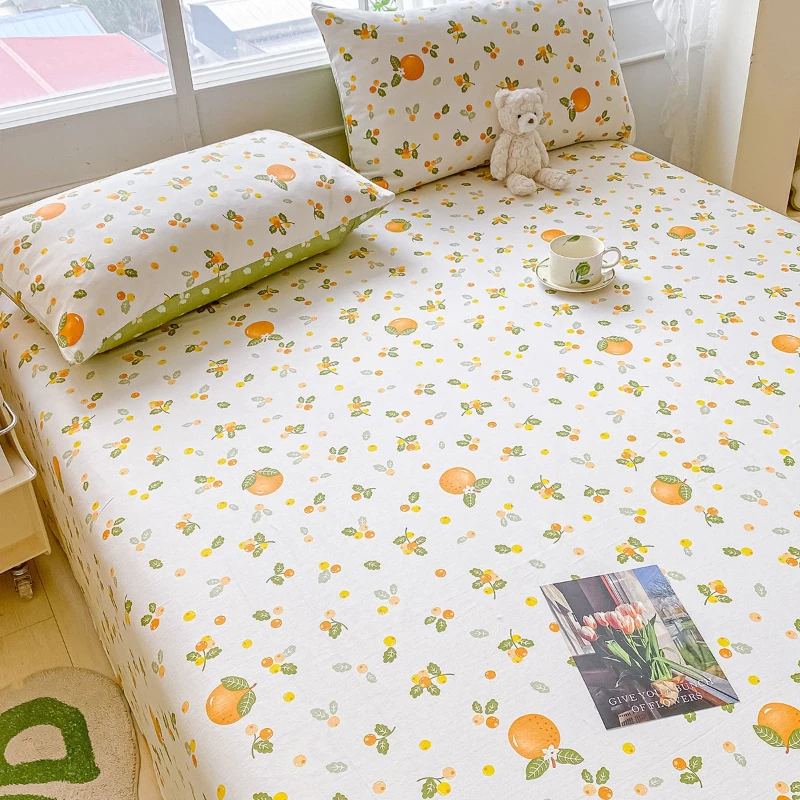 1Pc Aloe Vera Cotton Fitted Sheet Bedspread and Pillowcase Three-Piece Set Suitable for Apartment Bedroom Four-Season Universal Printing Ins Style Pure Color Simple 120/150/180cm