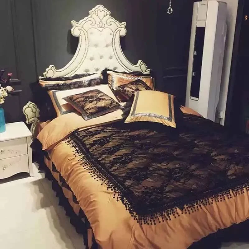 Chic Golden Embroidery Satin Cotton Bedding Set Luxury Beige Duvet Cover Bed Sheet Or Elastic Band Fitted Sheet Pillowcases