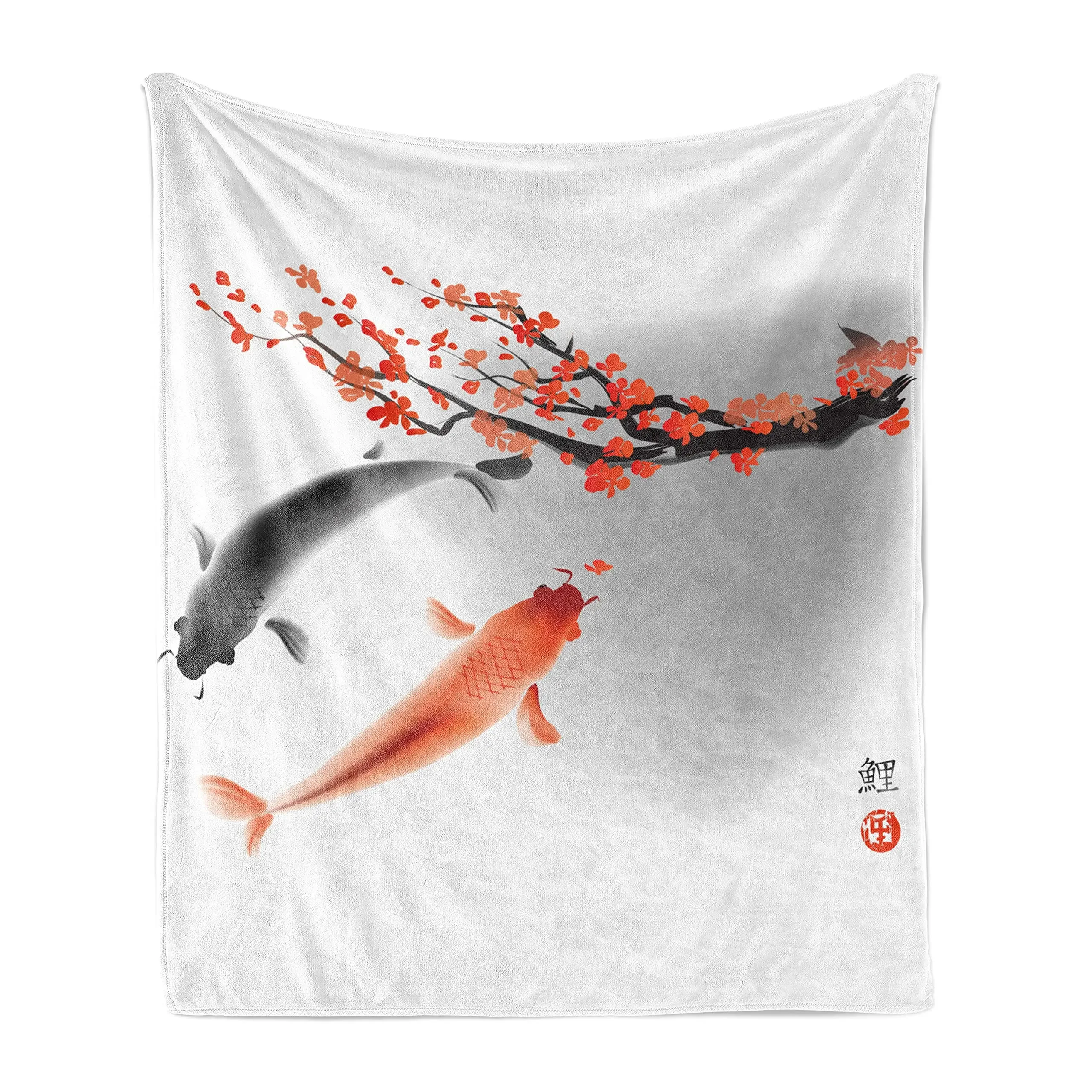 Japanese Throw Blanket, Koi Carp Fish Couple Swimming Cherry Blossom Sakura Branch Print Flannel Soft Blanket for Adults Gifts