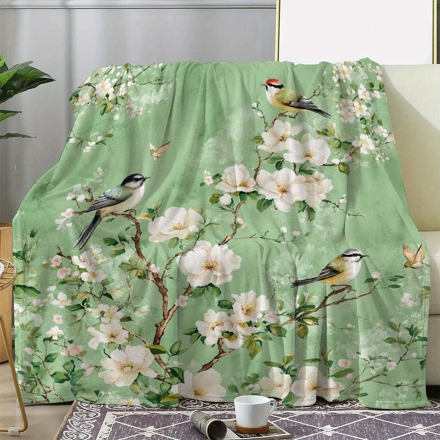 1pc Vintage Floral & Bird Print Flannel Blanket - Soft Warm All-Season Throw for Sofa Bed Car Camping Office, Cozy Gift with Nat