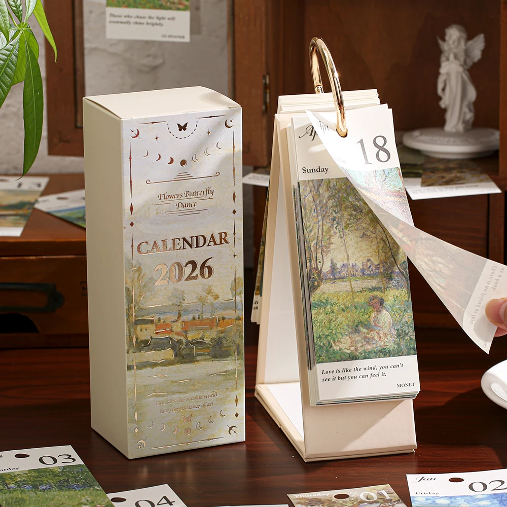 2026 Desk Calendar With Gold Ring Binding 365 Days Vintage Oil Painting Inspirational Quotes One-Way Page Turn Daily Planner