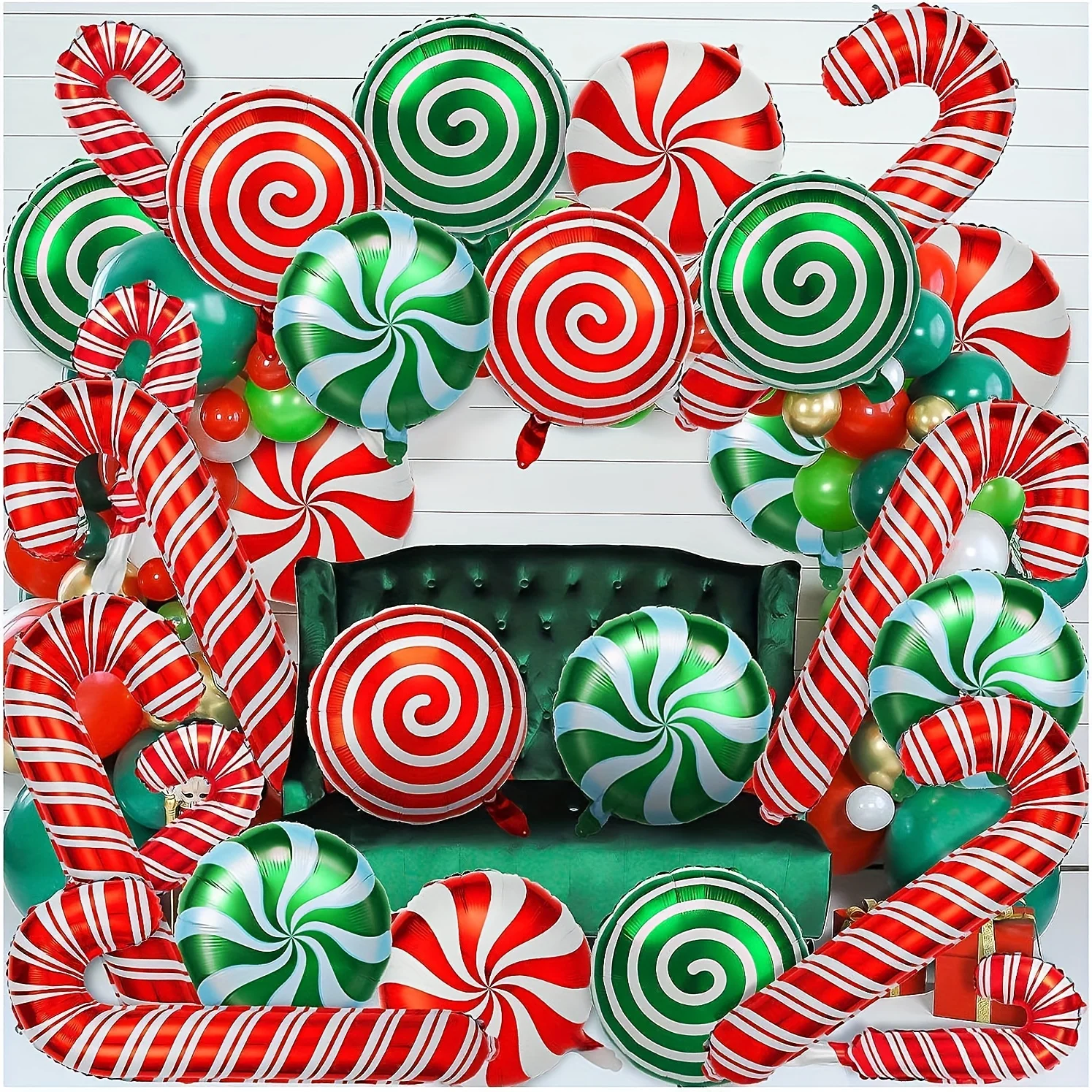 36pcs Christmas Candy Balloons Kit Cane Swirl Candy Foil Balloons Red Green Mylar Sweet Candies Balloons for Christmas Birthday