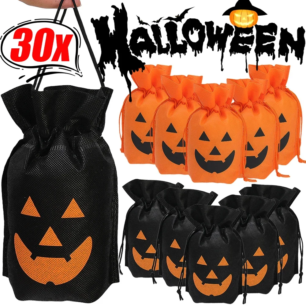 30/5PCS Halloween Cute Pumpkin Gift Bags Non-woven Fabric Biscuit Snacks Candy Bag with Drawstring Halloween Party Decoration