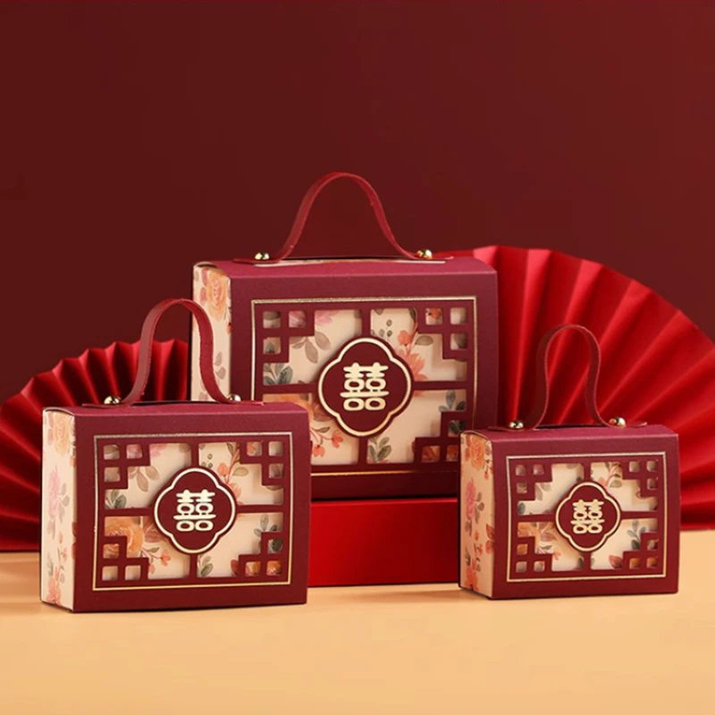 10pcs Portable Candy Boxes Red Chinese Style Wedding Gifts Packaging Box With Handle Birthday Party Chocolate Boxes Supplies