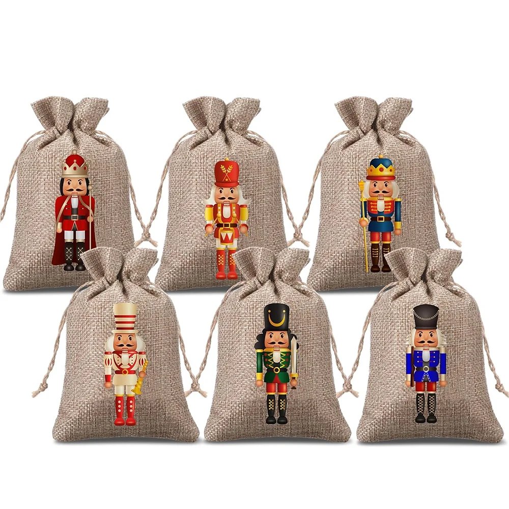 6Pcs Christmas Nutcracker Burlap Gift Bags Christmas Treat Bags Small Gift Sacks Candy Jewelry Pouches Xmas Winter Wedding Party