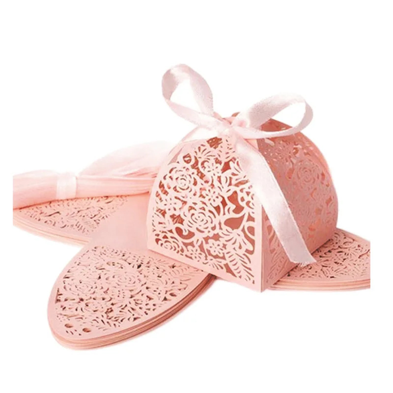 50Pcs Laser Cut Rose Flower Candy Gift Box Sweet Wedding Favor Gift Packaging Box With Ribbon Baptism Birthday Party Decoration