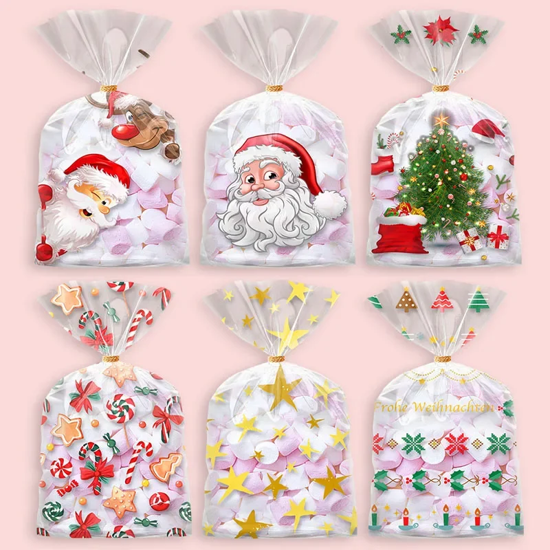 50Pcs Xmas Gift Pouches Snowman Santa Claus Elk Plastic Packaging Bags For Candy Chocolate 2025 Christmas Party Decorations