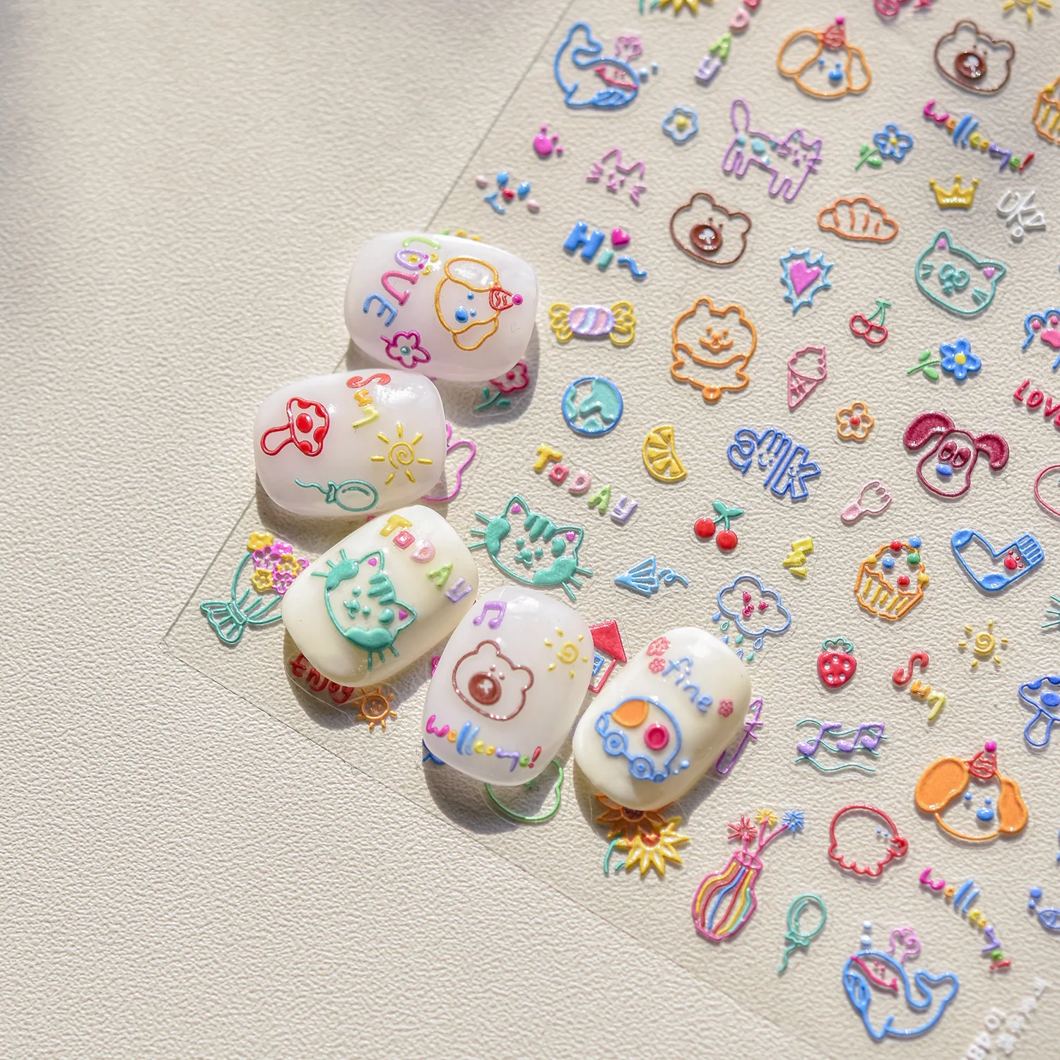 Cute Animal Graffiti Cat Claw Rabbit Bunny Bear Dog Flower Fruit Dim Sum Candy Sunflower Relief Adhesive Nail Art Stickers Decal