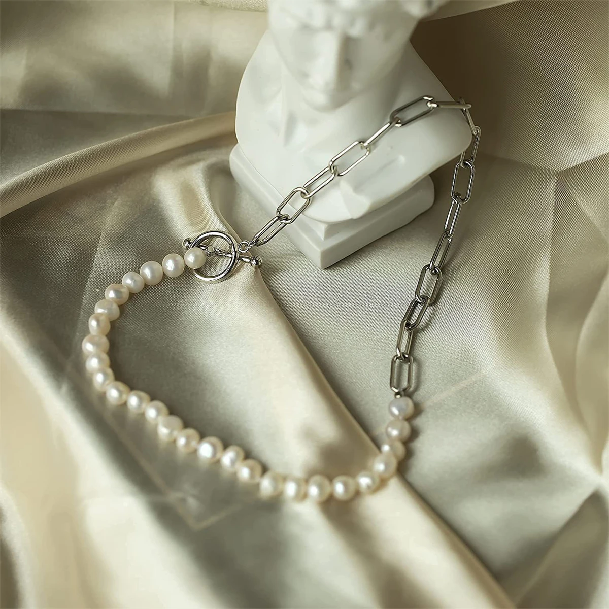 Hot selling classic OT paper clip chain pearl chocolate retro punk style thick chain fashionable splicing collarbone chain