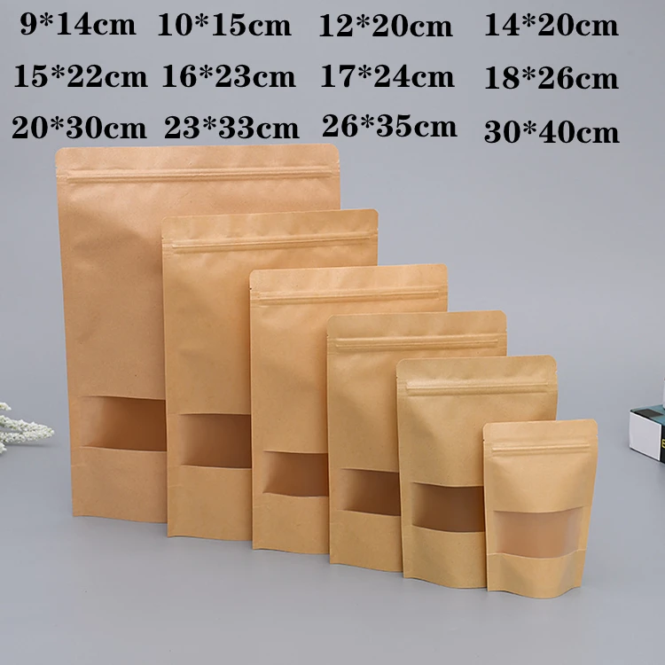 100pcs Kraft paper window zipper bag brown reusable self-sealing candy bread cookie gift bag