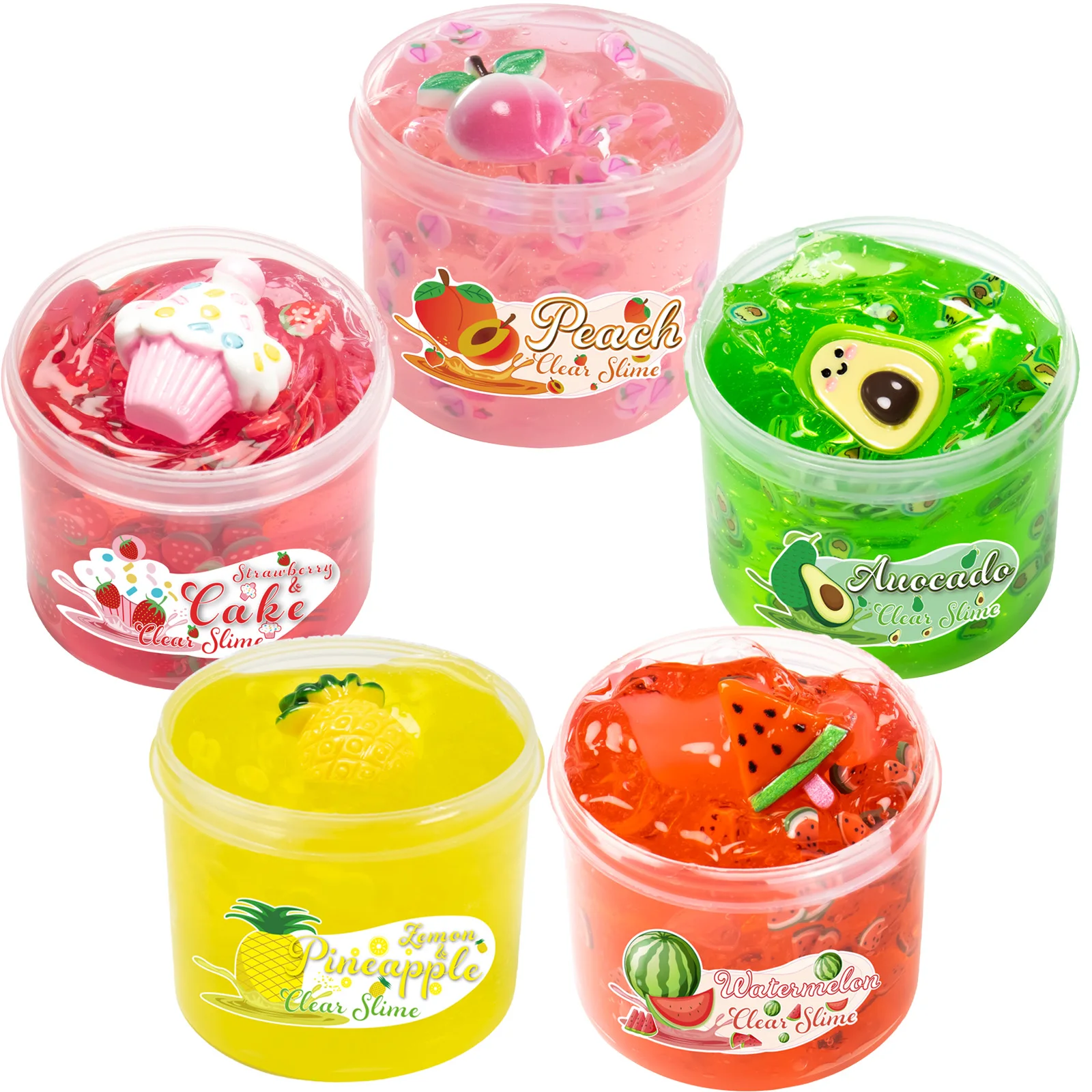 70ml Crystal Clear Slime with Watermelon Peach Avocado Pineapple Charms-Non-Sticky Soft Jelly Clay For Party Christmas Gift