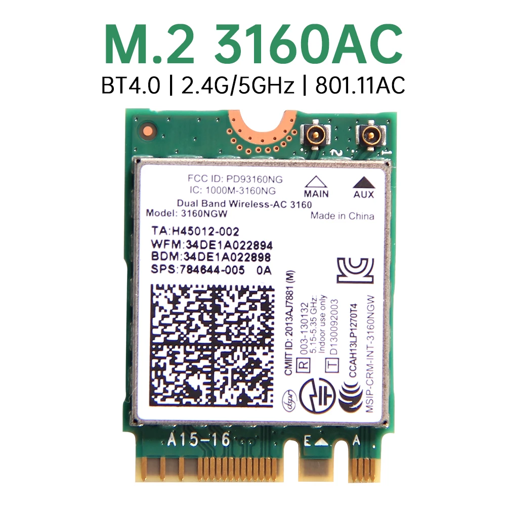 Wireless-AC 3160 3160NGW Bluetooth 4.0 NGFF Wifi Card Dual Band 2.4G/5GHz 802.11ac M.2 Network Adapter