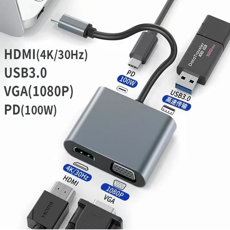 4K@30HZ Type C plug to HDMI-compatible USB C 3.0 VGA PD100w Adapter Dock Hub cable for Laptops/Tablets/Mobile Phones Projector