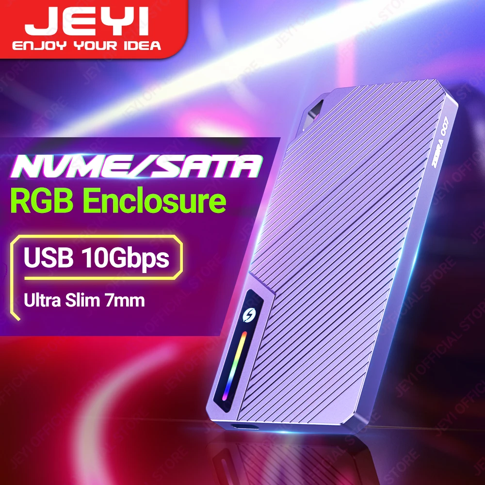 JEYI Ultra Slim RGB M.2 SSD Enclosure, Dual Protocols NVMe SATA USB 3.2 10Gbps RGB Light Hard Drive Case With Wirte Protection