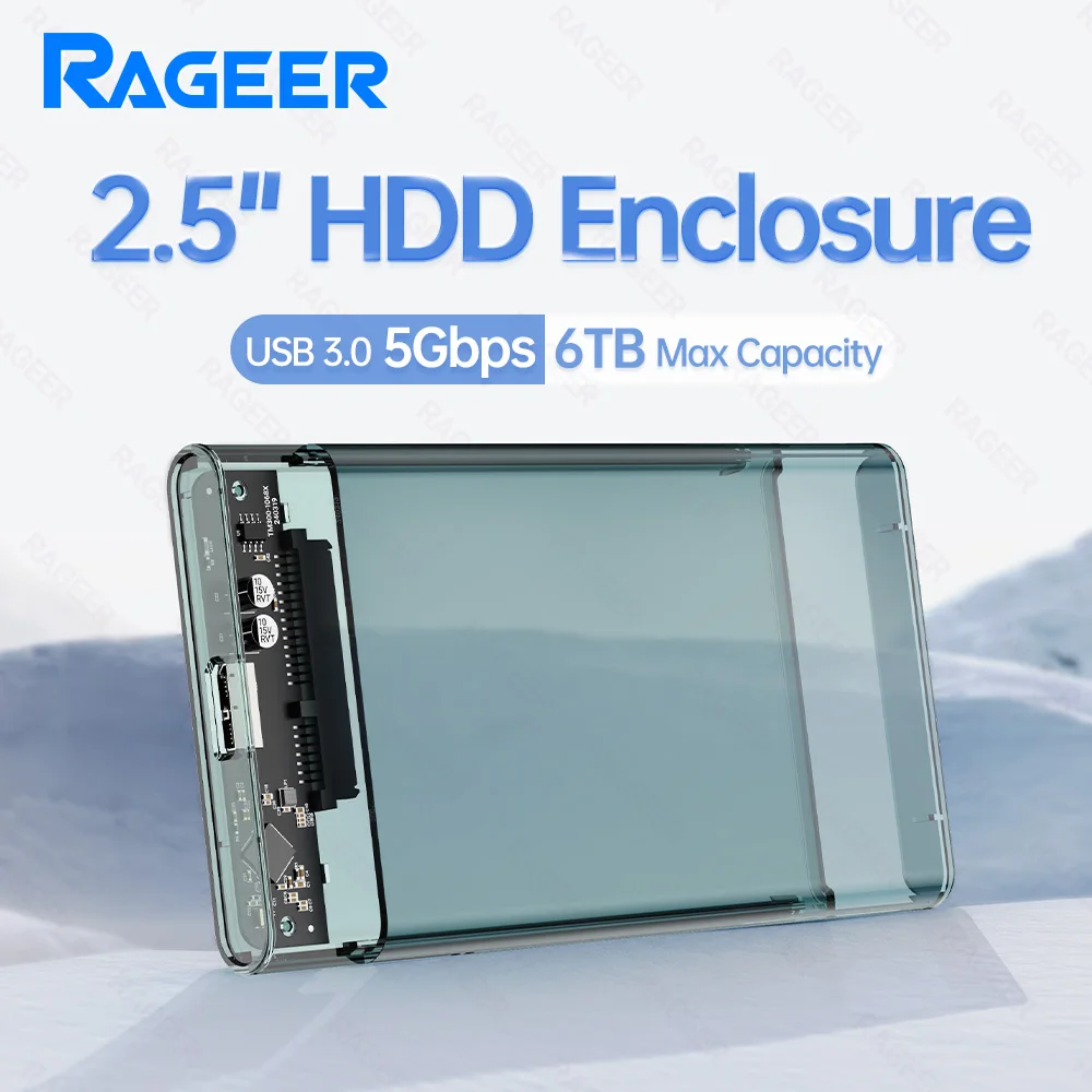 RAGEER Tool-Free Transparent Gray 2.5'' External Hard Drive Enclosure USB to SATA III 5Gbps HDD Case for 7mm/9.5mm Drives w/UASP