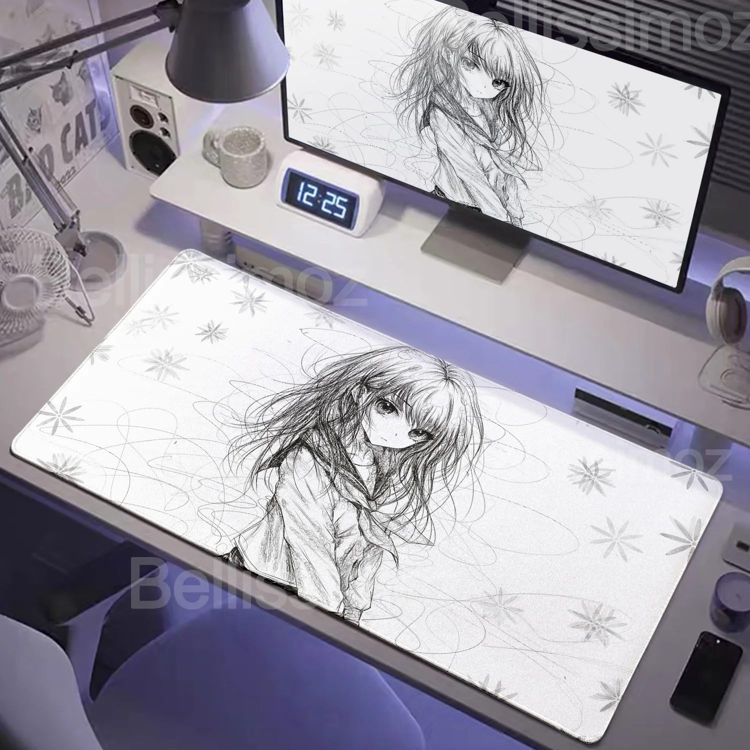 New Line Drawing Black and White Cute Anime Girl Desk Mat Large Mouse Pad Office Keyboard Locking Edge Gaming Non-slip Mousepad  Read more